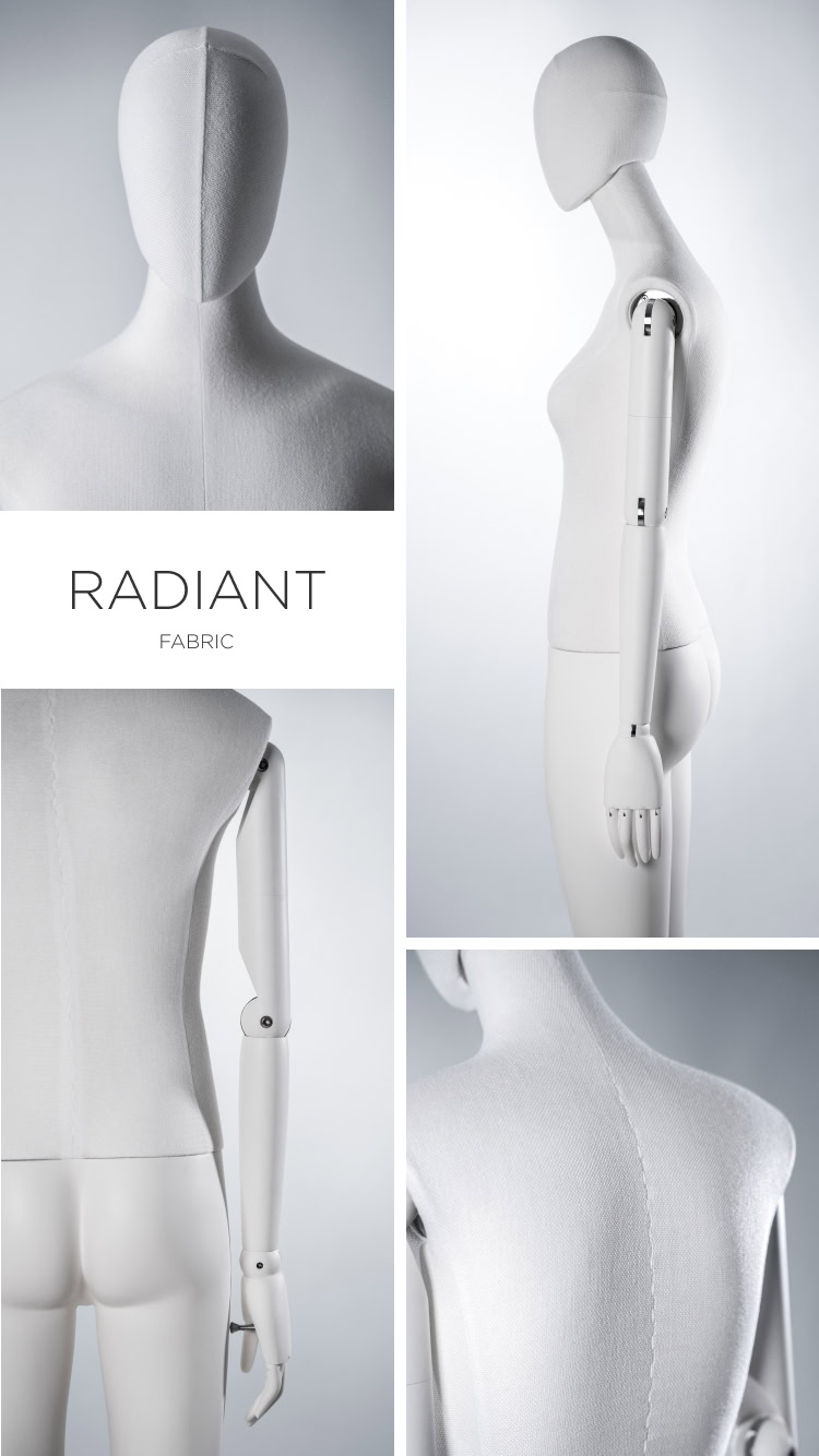 Explore the latest drop of refined silhouettes in our RADIANT collection, now available in white fabric with articulated arms and elegant wooden hands.